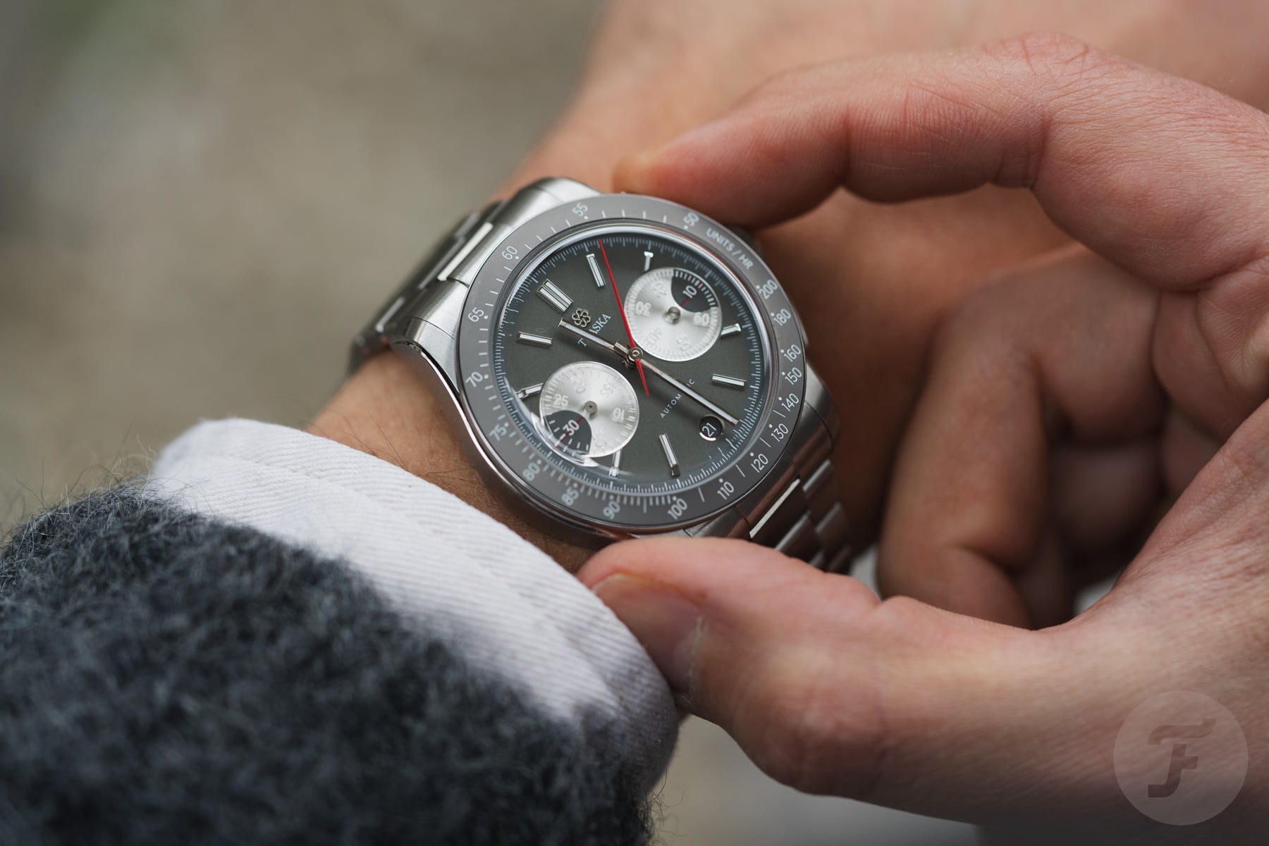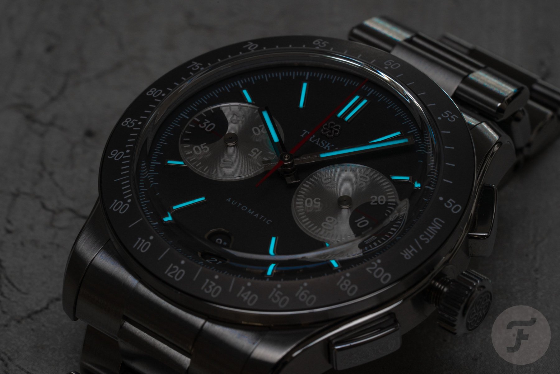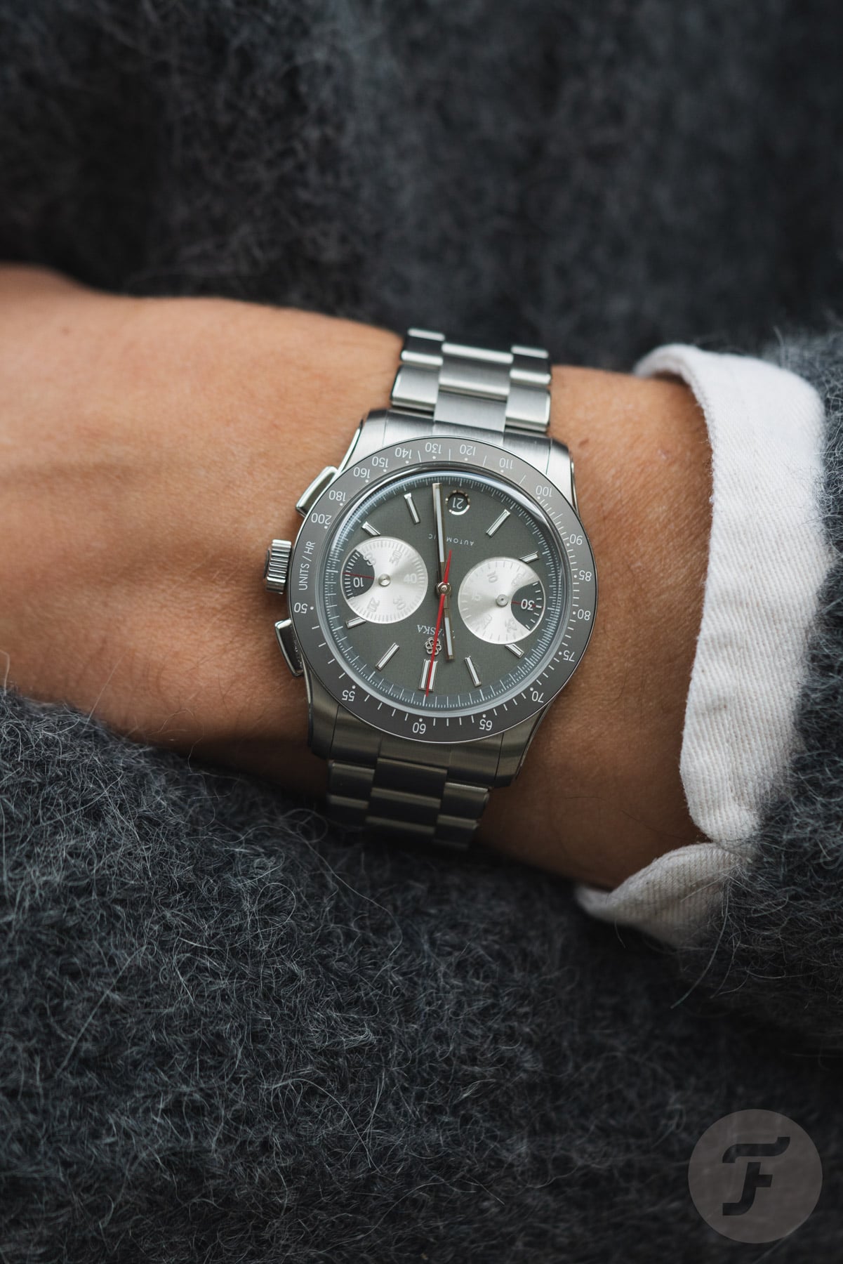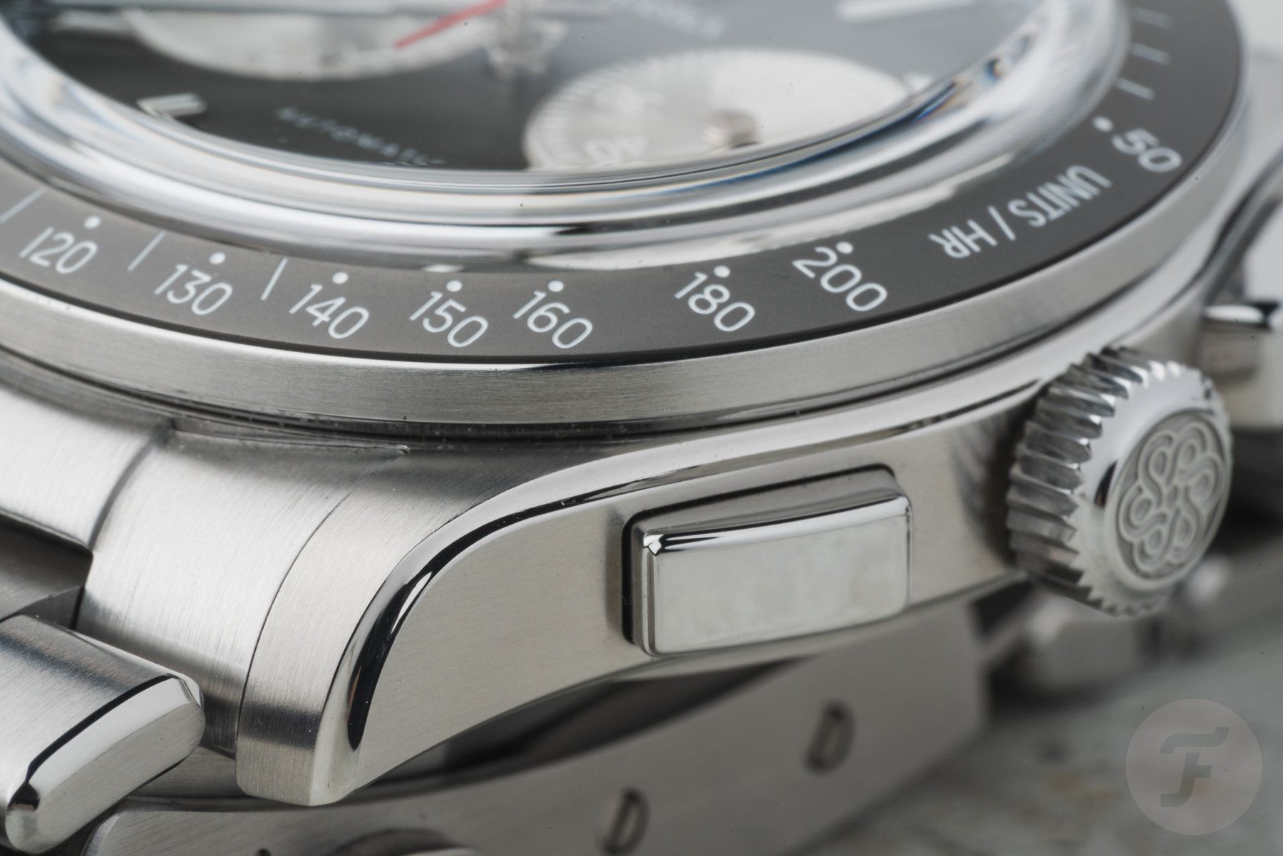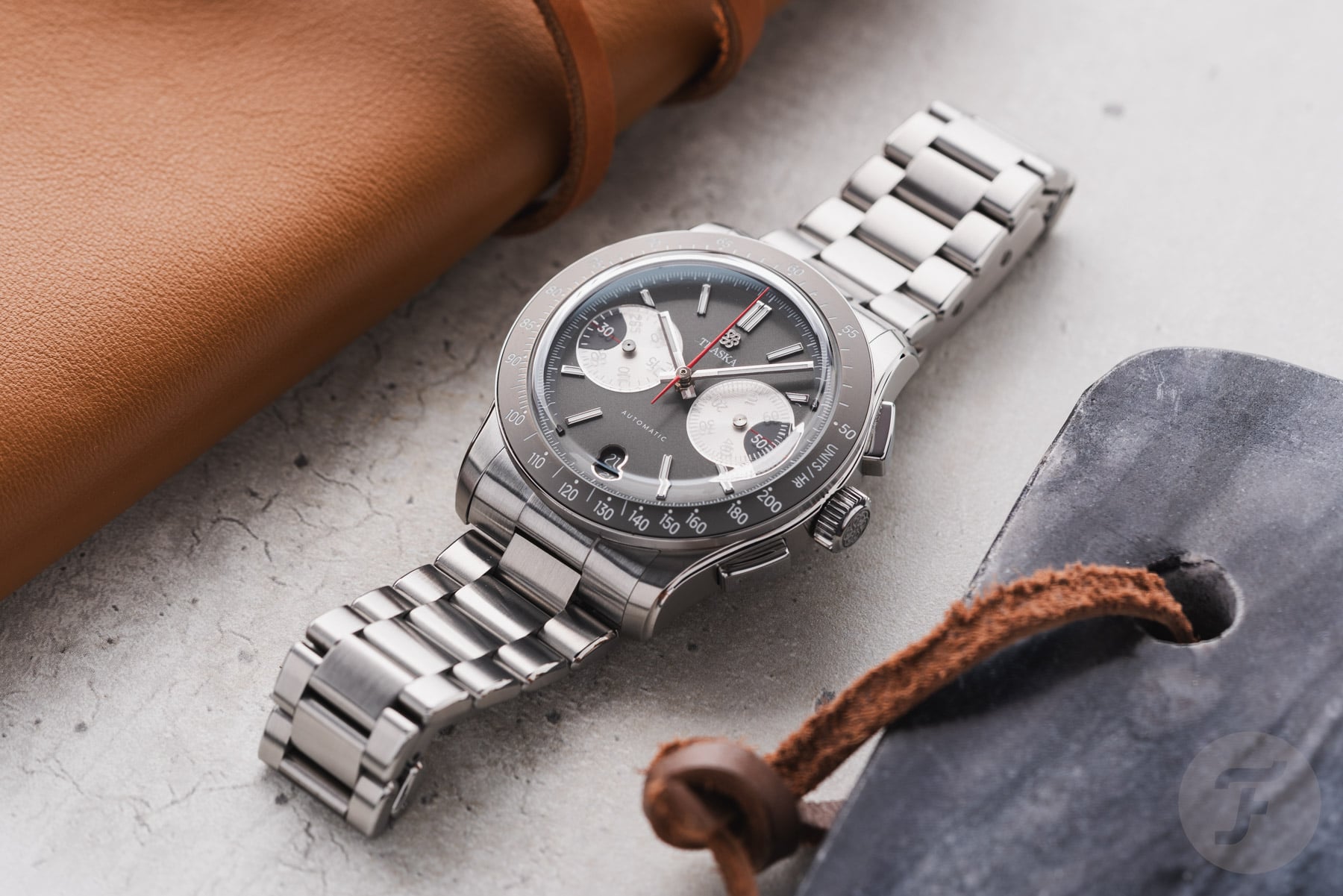 The bezel features a tungsten insert that complements the dial’s gray tone nicely. Traska chose tungsten for its scratch resistance, and it also adds a nice flair to the watch. As you can see, the insert doesn’t feature a normal tachymeter scale. The white tachymeter scale is compressed to a range of 200–50 units per hour. This range is less extreme than we usually see and, therefore, is more applicable to measuring things in “normal life” rather than in the world of racing.