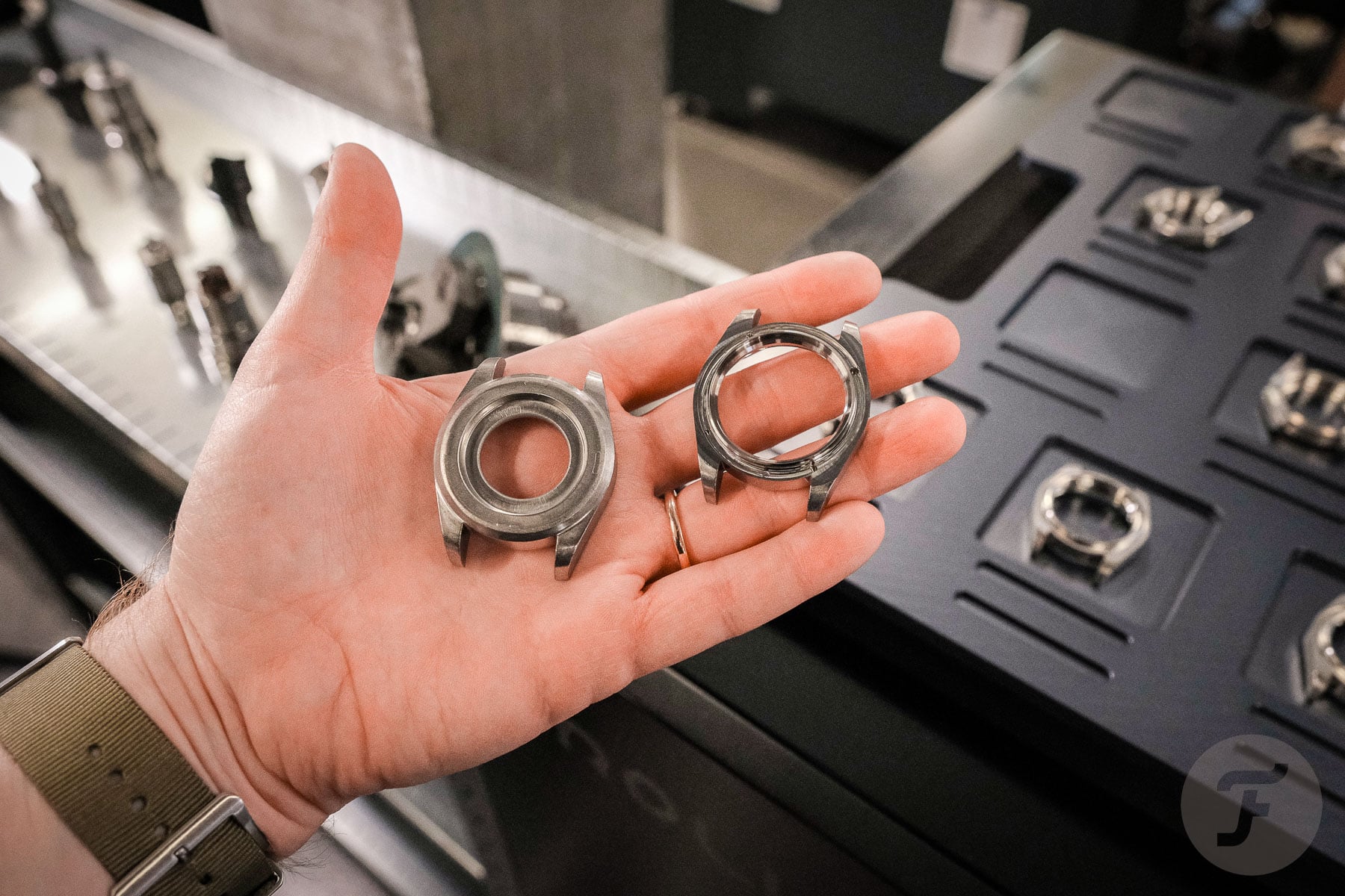 Interestingly, titanium cases don’t go through the same process. These are cut from blank sheets, then heated red-hot and stamped with over 800 tons of force. This gets cases to roughly the right shape.