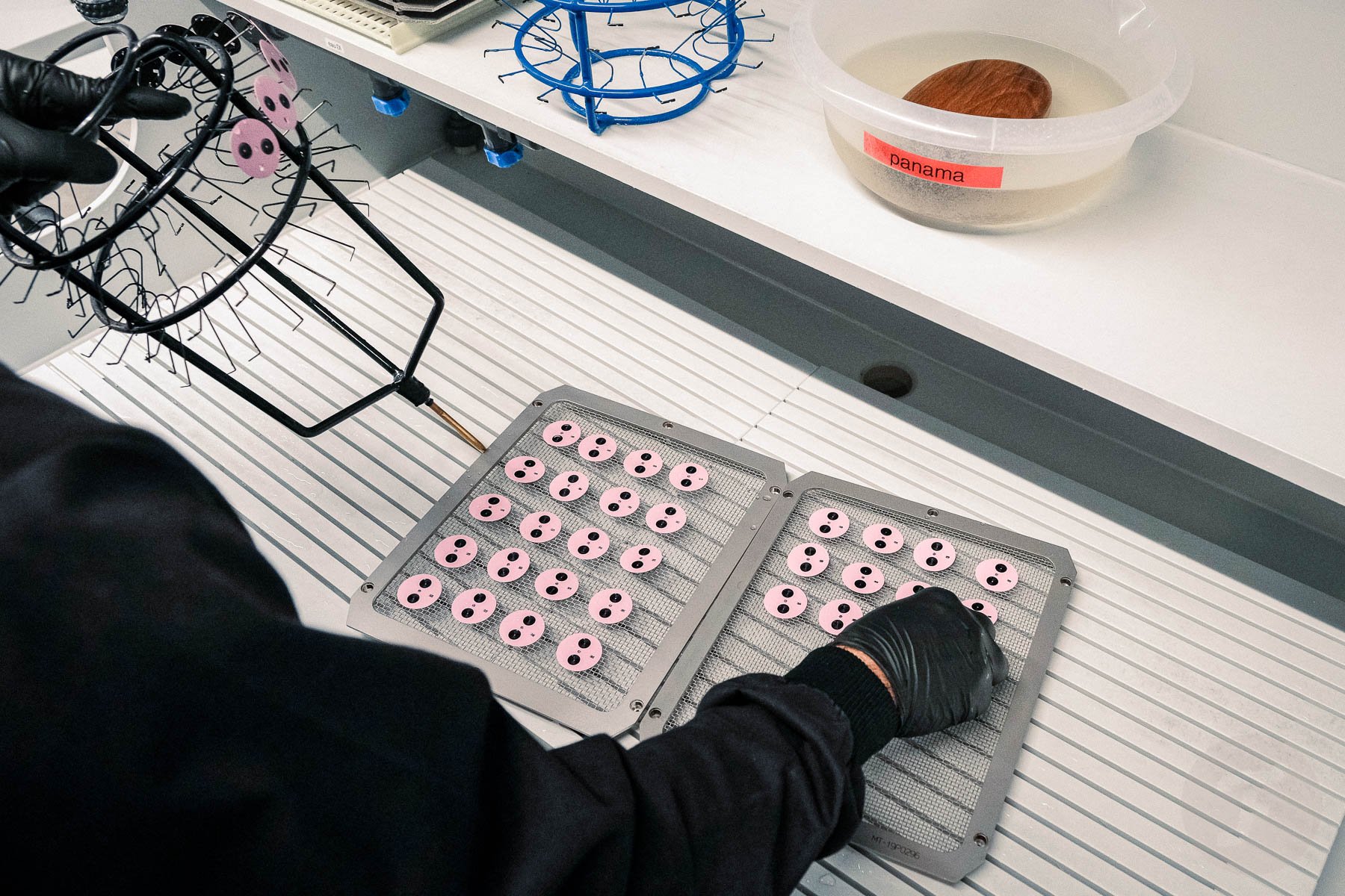 Once the dials are ready, it’s time to paint them. The first step here is to manually create the right shade. The paint is mixed, loaded, and air-brushed onto the dials, one coat at a time.