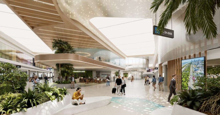 The project also includes future capability to process international arrivals, along with direct third-floor access to the airport’s customs hall. Renderings show larger gate areas, expanded seating and new dining and retail space.