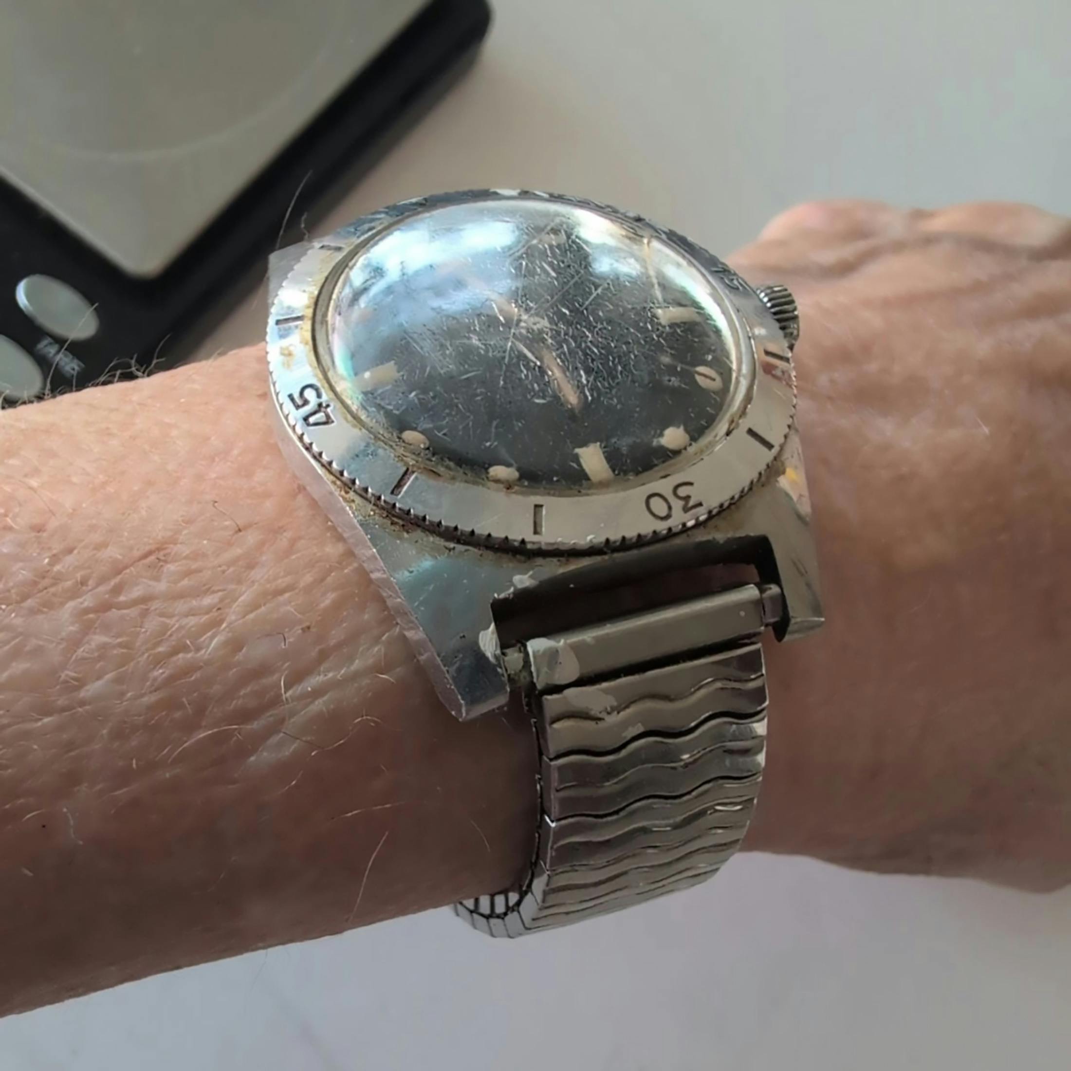 The example on offer—$275 at the time of writing—certainly isn’t flawless, as crown has likely been replaced at some point (it should be cross-hatched), the painted numerals on the bezel has mostly worn away, and there are two bits of loose lume floating around in the dial, which is strange only because the lume in the hands and on the plots seems intact. You do, however, get the original wooden box, which isn’t nothing. The listing says the watch is currently running and the date changes, but also recommends a service, meaning you have, with this watch, yet another opportunity to get to know your local watchmaker.