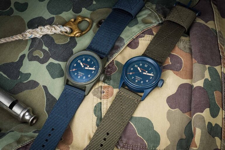 Anyone familiar with Cabourn’s work will already know his passion for vintage army style, so the UT5-TANC should feel right at home within the British designer’s aesthetics. The UT5-TANC takes the form of a compact expedition-style tool watch built around Unimatic’s 36mm Modello Cinque case. Made from 316L stainless steel and finished with a stonewashed Cerakote coating, the watch comes in two versions: UT5-TANC-A with a green case and UT5-TANC-B in navy blue, with both references sharing the same navy dial.