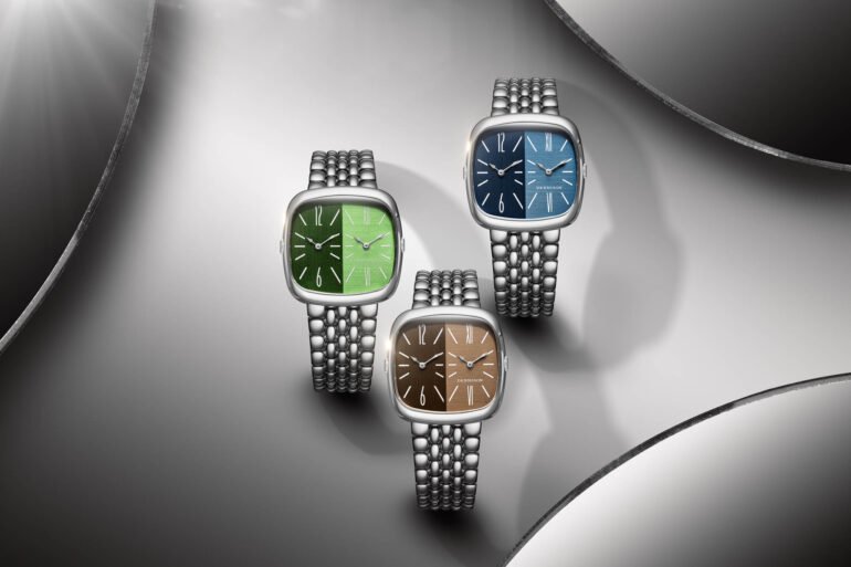 The indices, of course, are an instantly noticeable addition. They take on an art deco-inspired shape, with 12 and 6 o’clock in Arabic numerals on the left-hand dial, and in Roman numerals on the right. It helps echo the subtle variations between each face on the dial, and gives the Shades models a distinctly vintage look, furthered by 37mm by the 36.5mm “square” stainless steel case and pebble-link bracelet.