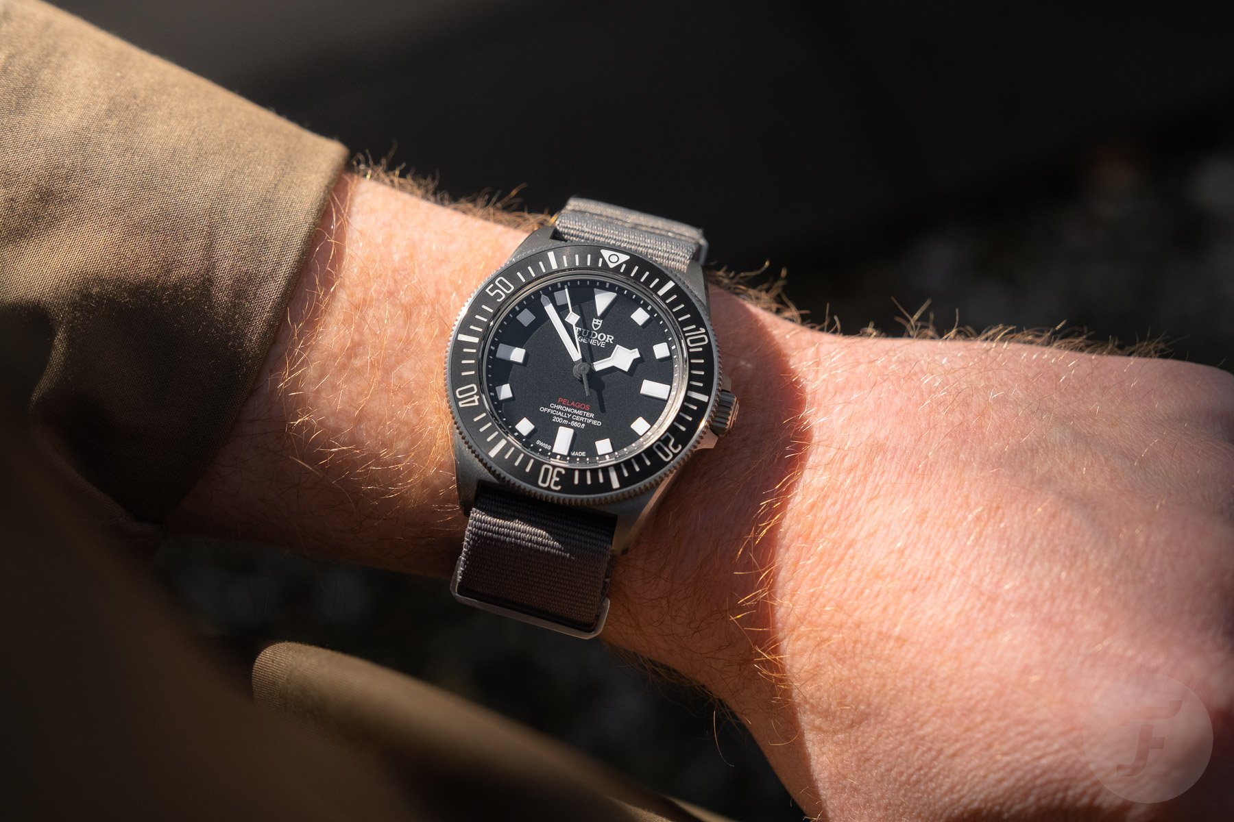 Nacho is wearing his Tudor Pelagos FXD, a modern titanium tool watch with fixed strap bars and a highly functional, no-nonsense design.