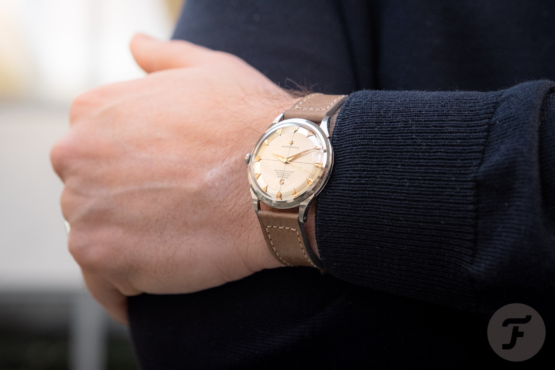 RJ is wearing his vintage Omega Constellation ref. CK2648-1 from 1952, a classic dress watch with a compact case and timeless mid-century design.
