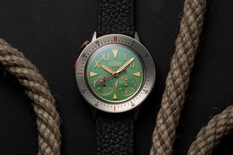 For the new Thundergraph Khumbu, Albishorn has introduced a green dial, which the brand says is inspired by the landscapes of the Khumbu region of northeastern Nepal. Like its predecessor, the dial features large Roman numerals and oversized, lume filled triangular indices that would help to easily orient a climber in a low legibility situation. The dial layout is a slightly skewed take on the classic “California” dial, which typically features a combination of Arabic and Roman numerals. Here, the Arabics have been jettisoned in favor of those triangular markers, which make more sense in concert with the running seconds and 30 minute counters located in the dial’s lower half.