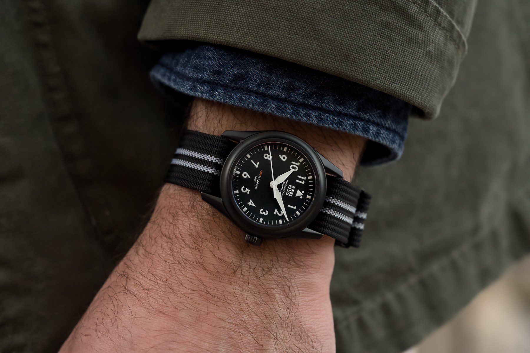 Visually, the Phantom gets the basics right. The dial is simple, legible, and clear without feeling too literal about its influences. HTD talks about classic flieger inspiration mixed with more modern typography, and that seems fair enough. The numerals are bold, the hands are easy to read, and nothing feels overworked. The blacked-out case helps a lot, too. The DLC coating gives the Phantom a more contemporary edge and stops it from feeling too traditional. It could easily have gone a bit tactical for the sake of it, but it doesn’t really do that. It just gives the watch a more serious look, which suits it.