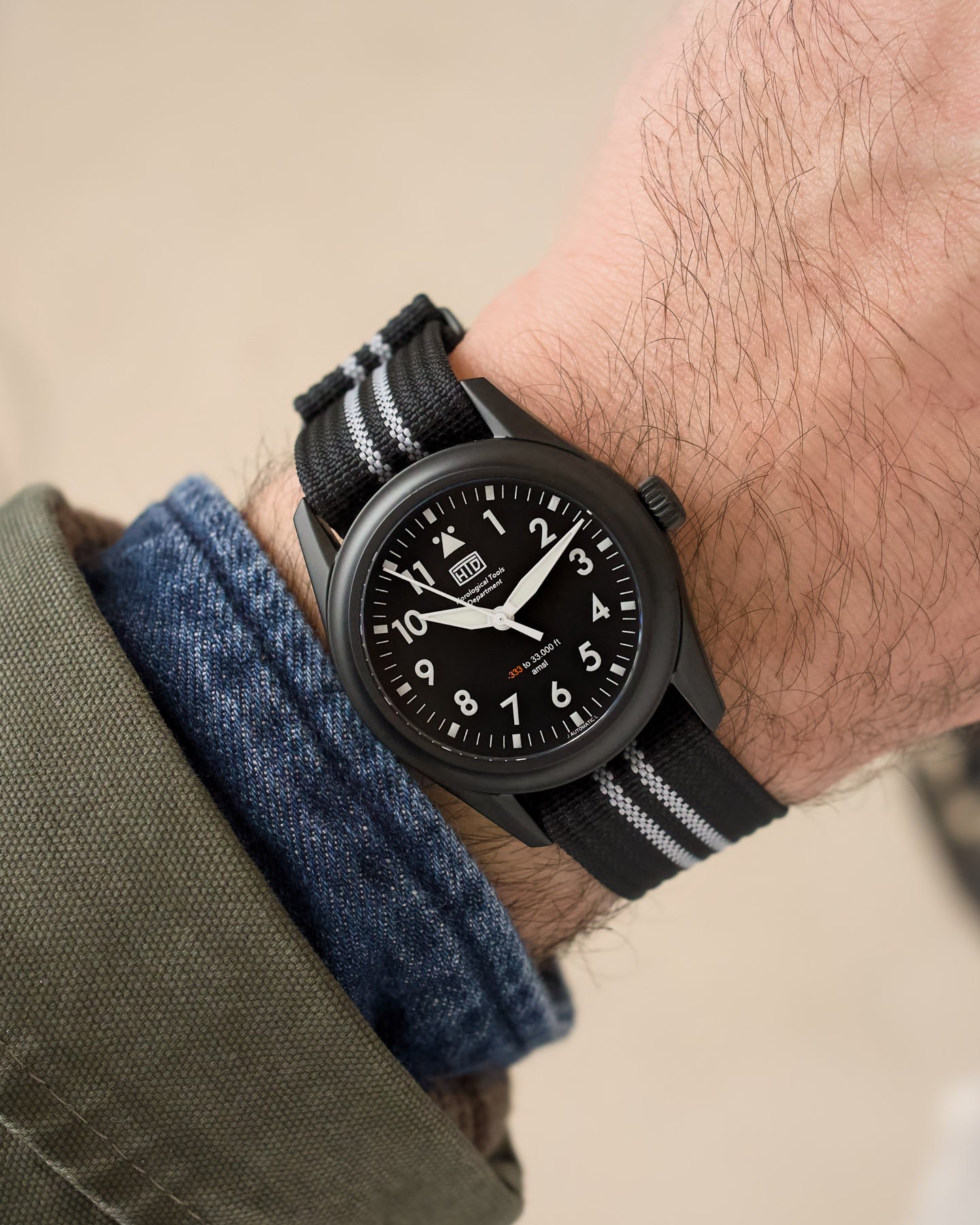 The size is what really sells it to me. HTD has gone with a 37mm case, 44mm lug-to-lug, and a slim 9mm profile. For a pilot’s watch, that’s quite refreshing. Brands still tend to default to bulk with pilot watches. Many seem to rely on sheer size to create their sense of purpose, as if they have to be broad, thick, and somewhat unwieldy to feel convincing. The Phantom doesn’t fall into that trap. These dimensions sound like they’ve been chosen by someone who actually wants the watch to be worn in the 21st century.