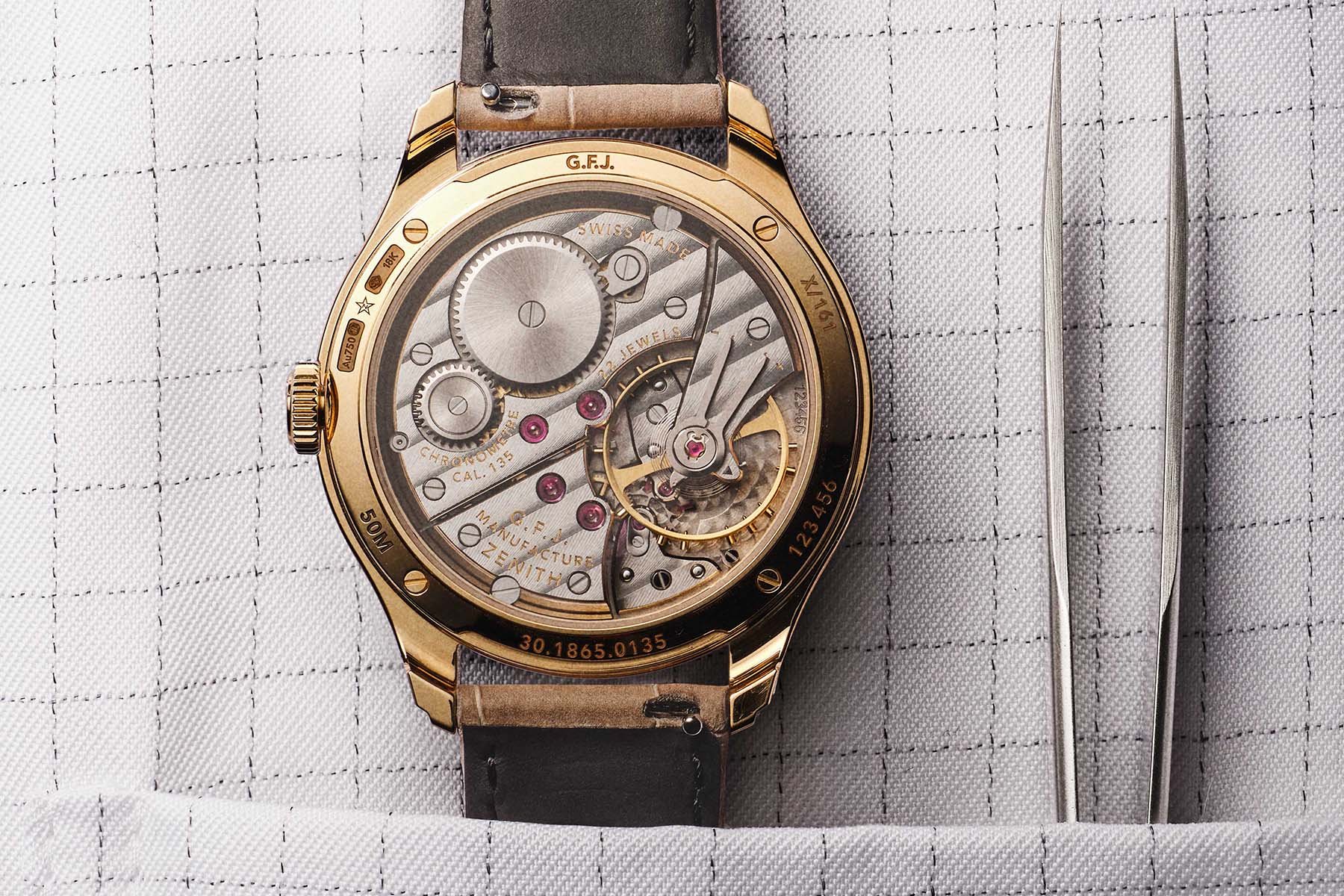 If you turn the watch around, you get a good view of the modern remake of the brand’s classic caliber 135 that won a plethora of awards at observatory chronometer competitions. This modern version is a manual-winding movement with a 2.5Hz (18,800vph) frequency and a 72-hour power reserve. Additionally, it is a COSC-certified chronometer, regulated to ±2 seconds per day by Zenith.