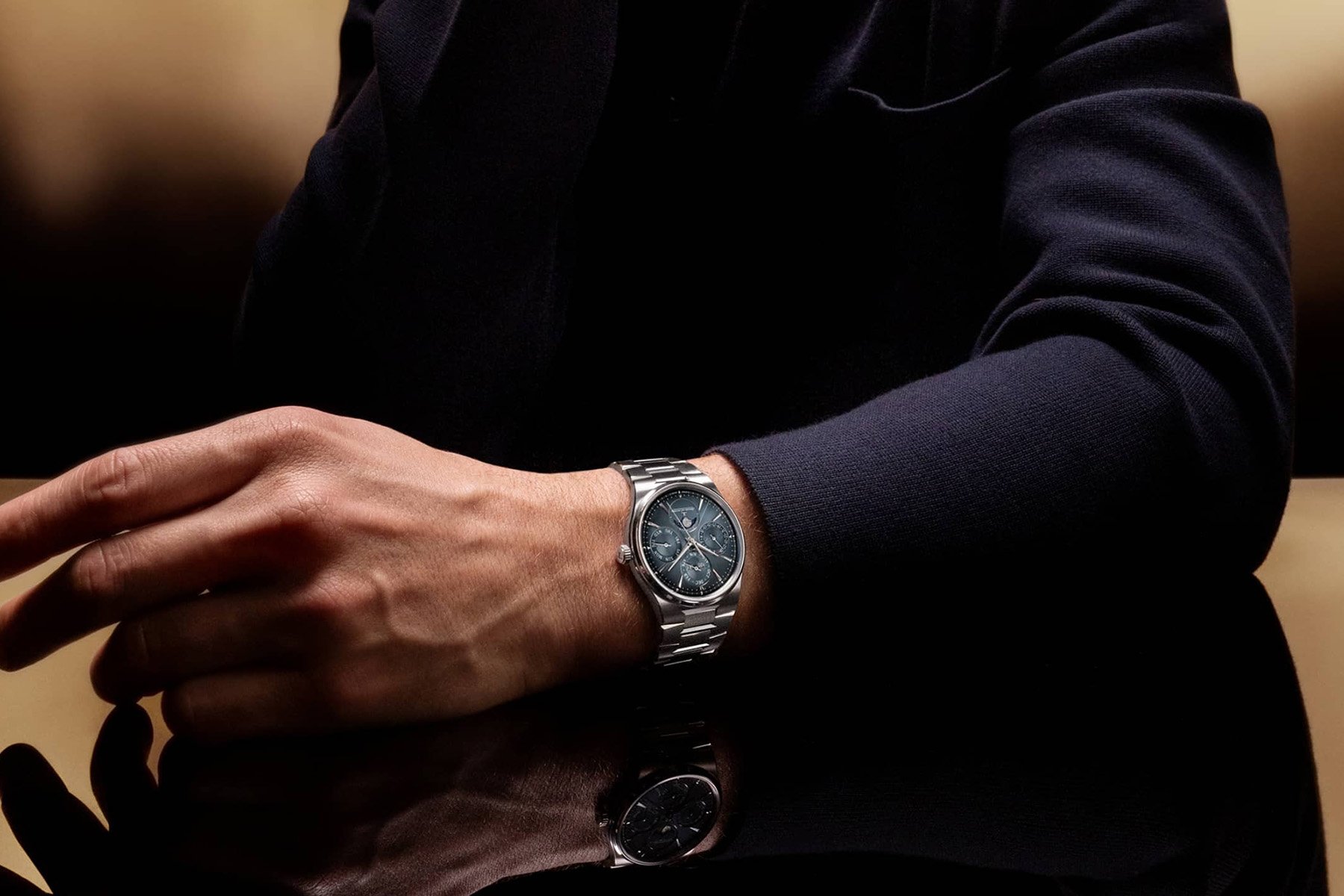The Master Control Chronometre Date Power Reserve completes this trio of new releases. The watch has the same 39mm case as the Master Control Chronometre Perpetual Calendar. But instead of offering the extensive calendar functions, this model features a power reserve indicator at 9 o’clock and a date display at 3. The numerals at 12 and 6 o’clock remain, so the design finds elements of the previous two models. Jaeger-LeCoultre specially developed the caliber 738 that powers this watch. The new 39-jewel automatic movement operates at 28,800 vibrations per hour and has a 70-hour power reserve. This last version costs €17,800 in stainless steel. It completes a remarkable trio that deserves the opening spot on this list.
