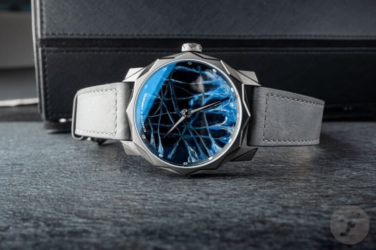 Whereas the artists are responsible for the dials, Schaefer himself designs the watches that serve as the canvas. For this Solune Antarctica Micro-Painting, it’s the brand’s signature 43 × 49.3 × 11.4mm case. This case features a 12-pointed bezel that emulates the Sun and sharp, angular lugs that make the large watches surprisingly comfortable. Alongside the regular stainless steel version, Schaefer also offers a gray ion-plated (IP) case, which is the version we had the chance to check out. It offers a nice, darker backdrop that puts the dial in the spotlight.