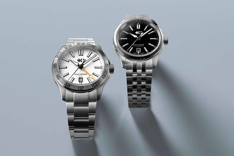 Dial options include white and sky blue in all three case sizes, with a pistachio option available only in 39mm, and a black dial available in 39mm and the new 42mm size. The dials are polished lacquer and now include longer indices and a GMT hand that has been redesigned to be more proportionate and is also fully lacquered. The “Sealander” wordmark also appears on the dial, at 6:00, for the first time. The Sealander GMT is powered by the Sellita SW330-2 caliber, a caller GMT with around 50 hours of power reserve.