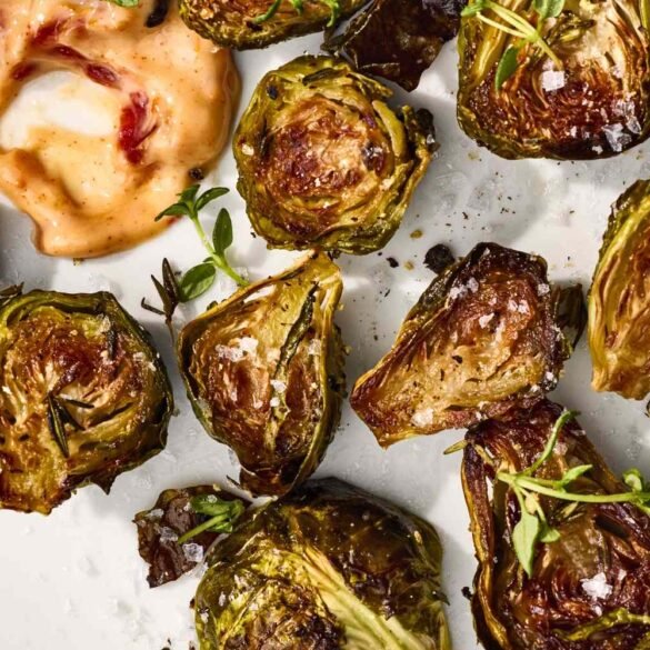 High heat delivers brussels sprouts with fork-tender centers and crisp, caramelized edges. A sun-dried tomato aïoli dipping sauce is tangy...