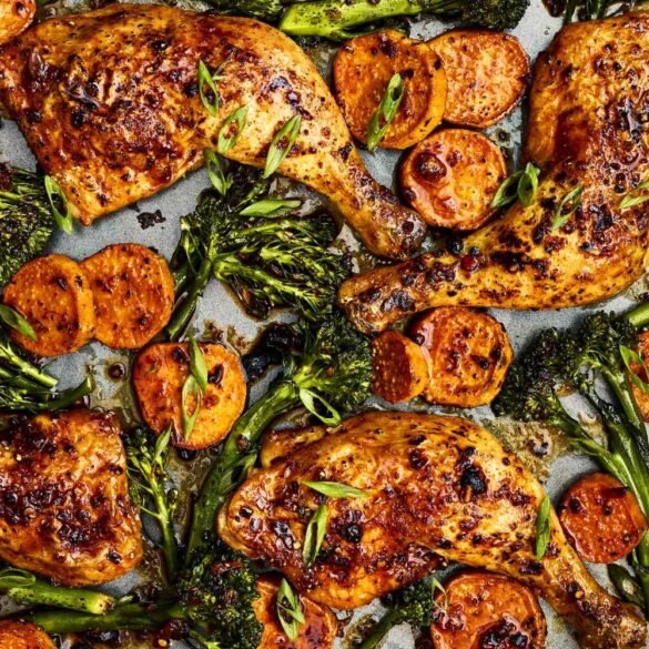 The chicken emerges from the oven juicy and charred with a glossy sweet-spicy glaze. The sweet potatoes become tender and...