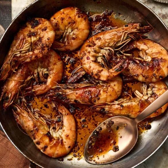 Cooking the shrimp with their shells on helps to insulate the tender meat and prevent overcooking. Bourbon in the butter...