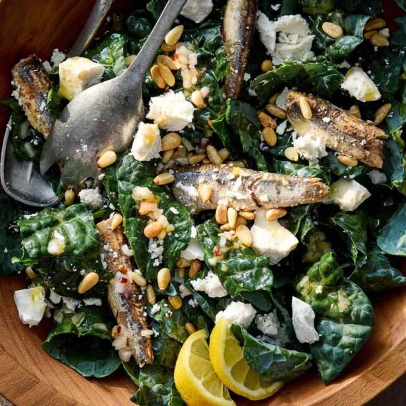WatchesKale Salad with Ricotta Salata, Pine Nuts, and Anchovies RecipeA bold, lemony vinaigrette creates a tangy, savory base that coats the torn kale leaves. Two tiers of dressed kale... Read More