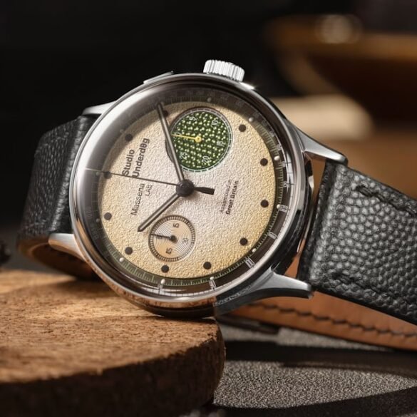 There’s a lot to take in with this two-layer dial, with the base executed in a radially brushed metallic sunray...