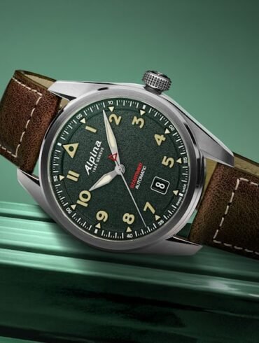 The oversized lume-filled Alpina logo, scripted in white, sits at 12 o’clock, with a black date window featuring white numbers...
